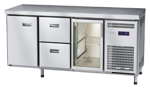 Холодильный стол Abat СХС-60-02 предназначен для раскатки теста, обработки ингредиентов для приготовления блюд, охлаждения и кратковременного хранения скоропортящихся продуктов и напитков на предприятиях общественного питания и торговли. Модель оснащена неохлаждаемой рабочей поверхностью, распашной стеклянной дверцей с уплотнителями с магнитной вставкой слева, 2 ящиками посередине, распашной дверцей с уплотнителями с магнитной вставкой справа и регулируемыми по высоте ножками.
