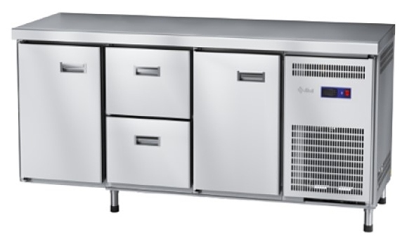 Холодильный стол Abat СХС-70-02 предназначен для раскатки теста, обработки ингредиентов для приготовления блюд, охлаждения и кратковременного хранения скоропортящихся продуктов и напитков на предприятиях общественного питания и торговли. Модель оснащена неохлаждаемой рабочей поверхностью, 2 распашными дверцами с уплотнителями с магнитной вставкой (справа и слева), 2 ящиками (посередине) и регулируемыми по высоте ножками.