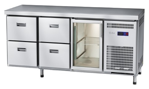 Холодильный стол Abat СХС-70-02 предназначен для раскатки теста, обработки ингредиентов для приготовления блюд, охлаждения и кратковременного хранения скоропортящихся продуктов и напитков на предприятиях общественного питания и торговли. Модель оснащена оснащена неохлаждаемой рабочей поверхностью, распашной стеклянной дверцей с уплотнителями с магнитной вставкой слева, 4 ящиками (посередине и справа) и регулируемыми по высоте ножками.