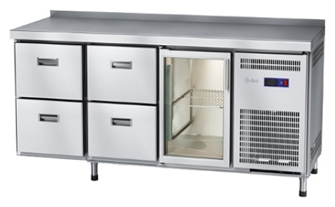 Холодильный стол Abat СХС-70-02 предназначен для раскатки теста, обработки ингредиентов для приготовления блюд, охлаждения и кратковременного хранения скоропортящихся продуктов и напитков на предприятиях общественного питания и торговли. Модель оснащена оснащена неохлаждаемой рабочей поверхностью, распашной стеклянной дверцей с уплотнителями с магнитной вставкой слева, 4 ящиками (посередине и справа) и регулируемыми по высоте ножками.