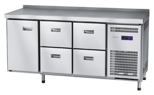 Холодильный стол Abat СХС-70-02 предназначен для раскатки теста, обработки ингредиентов для приготовления блюд, охлаждения и кратковременного хранения скоропортящихся продуктов и напитков на предприятиях общественного питания и торговли. Модель оснащена неохлаждаемой рабочей поверхностью, 4 ящиками (посередине и слева), распашной дверцей с уплотнителями с магнитной вставкой справа и регулируемыми по высоте ножками.