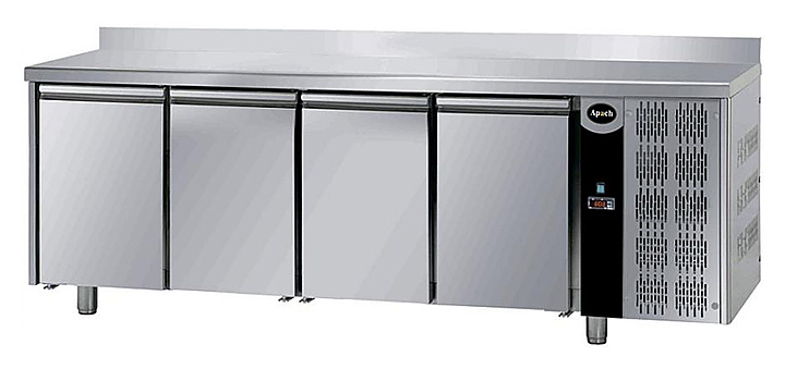 Холодильный стол Apach AFM 04AL предназначен для раскатки теста, обработки, охлаждения и кратковременного хранения продуктов, полуфабрикатов и напитков на предприятиях общественного питания и торговли. Модель с электронной панелью управления оснащена самозакрывающимися дверями с магнитным уплотнителем. Корпус и внутренняя камера изготовлены из нержавеющей стали AISI 304, изоляция - из пенополиуретана толщиной 40 мм.
