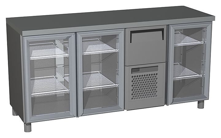 Холодильный стол Сarboma T57 M3-1-G 0430 (BAR-360С) предназначен для раскатки теста, обработки ингредиентов для приготовления блюд, охлаждения и кратковременного хранения скоропортящихся продуктов и напитков на предприятиях общественного питания и торговли. Модель оснащена охлаждаемым ящиком и регулируемыми ножками высотой от 90 до 110 мм. Цельнозаливной корпус выполнен из нержавеющей стали, дверцы - из стекла.