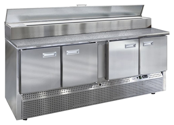 Холодильный стол Finist СХСнпцг-700-4 предназначен для хранения скоро портящихся полуфабрикатов из мяса, рыбы и других ингридиентов для приготовления пиццы на предприятиях общественного питания и торговли. Модель оснащена расположенным снизу агрегатным отсеком, столешницей с отсеком для гастроемкостей с крышкой, 4 холодильными камерами с распашными дверцами, устойчивыми ножками с подпятниками, кабелем питания с евровилкой и кнопочной панелью управления с цифровым дисплеем. Корпус выполнен из высококачественной нержавеющей стали, столешница – из гранита.