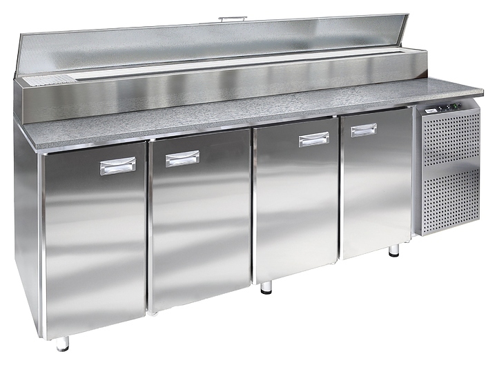 Холодильный стол Finist СХСпцг-700-4(1/3) предназначен для хранения скоропортящихся полуфабрикатов из мяса, рыбы и других ингридиентов для приготовления пиццы на предприятиях общественного питания и торговли. Модель оснащена встроенным холодильным агрегатом с боковым расположением, столешницей повышенной прочности, охлаждаемым салат-баром для гастроемкостей с крышкой, холодильной камерой с 4 секциями с распашными дверьми, устойчивыми опорами с подпятниками, кабелем питания с евровилкой и панелью управления. Корпус за исключением задней стенки выполнен из высококачественной нержавеющей стали, столешница – из гранита.