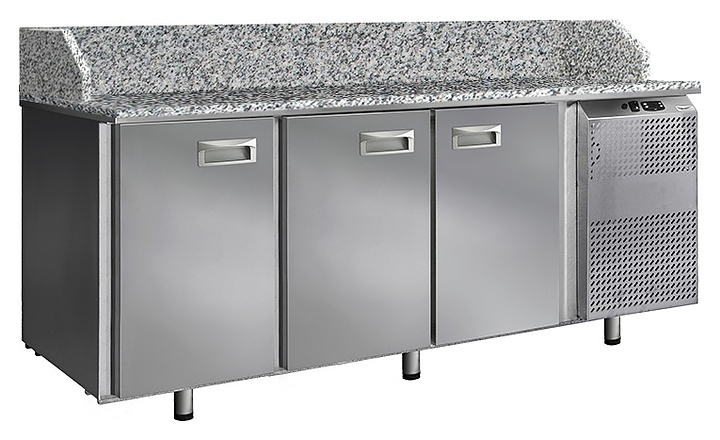 Холодильный стол Finist СХСпцгб-700-3 предназначен для хранения скоро портящихся полуфабрикатов из мяса, рыбы и других ингридиентов для приготовления пиццы на предприятиях общественного питания и торговли. Модель оснащена расположенным сбоку агрегатным отсеком, столешницей с задним и боковыми бортами, 3 холодильными камерами с распашными дверцами, устойчивыми ножками с подпятниками, кабелем питания с евровилкой и кнопочной панелью управления с цифровым дисплеем. Корпус выполнен из высококачественной нержавеющей стали, столешница и борты – из гранита.