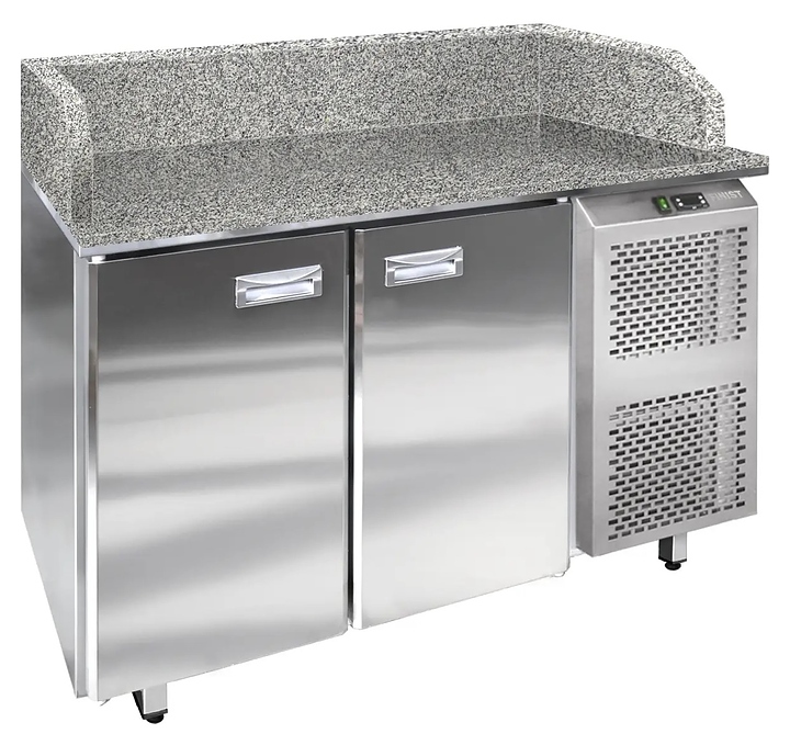 Холодильный стол Finist СХСпцгбя-700-2 предназначен для хранения скоропортящихся полуфабрикатов из мяса, рыбы и других ингридиентов для приготовления пиццы на предприятиях общественного питания и торговли. Модель оснащена встроенным холодильным агрегатом с боковым расположением, столешницей повышенной прочности с задним и боковыми бортами, холодильной камерой с 2 секциями с распашными дверьми, нейтральной секцией с 6 выдвижными ящиками, устойчивыми опорами с подпятниками, кабелем питания с евровилкой и панелью управления. Корпус выполнен из высококачественной нержавеющей стали, столешница и борты – из гранита.