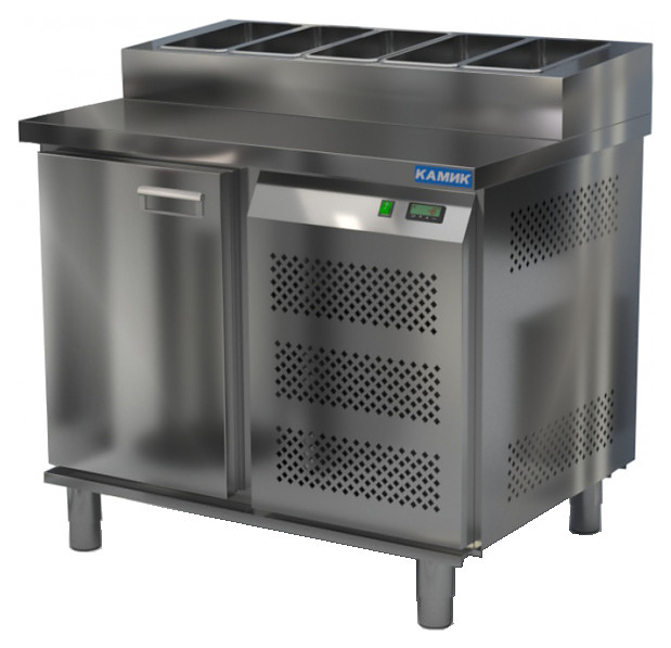 Холодильный стол КАМИК СОП-101076 используется на предприятиях общественного питания и торговли для охлаждения и хранения продуктов, напитков и готовых блюд, а также для раскатки теста и обработки ингредиентов для приготовления пиццы. Конструкция разделена на секции, каждая секция с дверью оборудована сетчатой полкой и парой направляющих. Корпус выполнен из нержавеющей стали AISI 430 толщиной 1 мм, столешница - из нержавеющей стали AISI 304 толщиной 1 мм.