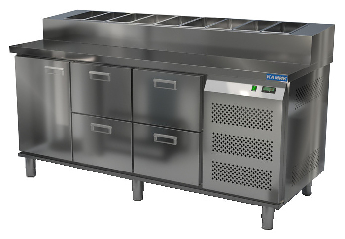 Холодильный стол КАМИК СОП-1418576 используется на предприятиях общественного питания и торговли для охлаждения и хранения продуктов, напитков и готовых блюд, а также для раскатки теста и обработки ингредиентов для приготовления пиццы. Конструкция разделена на секции, каждая секция с дверью оборудована сетчатой полкой и парой направляющих. Корпус и столешница выполнены из нержавеющей стали.