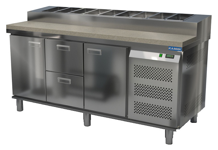 Холодильный стол КАМИК СОП-2218573 используется на предприятиях общественного питания и торговли для охлаждения и хранения продуктов, напитков и готовых блюд, а также для раскатки теста и обработки ингредиентов для приготовления пиццы. Конструкция разделена на секции, каждая секция с дверью оборудована сетчатой полкой и парой направляющих. Корпус выполнен из нержавеющей стали AISI 430 толщиной 1 мм, столешница - из нержавеющей стали AISI 304 толщиной 1 мм.