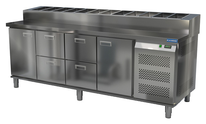 Холодильный стол КАМИК СОП-242376 используется на предприятиях общественного питания и торговли для охлаждения и хранения продуктов, напитков и готовых блюд, а также для раскатки теста и обработки ингредиентов для приготовления пиццы. Конструкция разделена на секции, каждая из которых оборудована сетчатой полкой и парой направляющих. Корпус и столешница выполнены из нержавеющей стали..