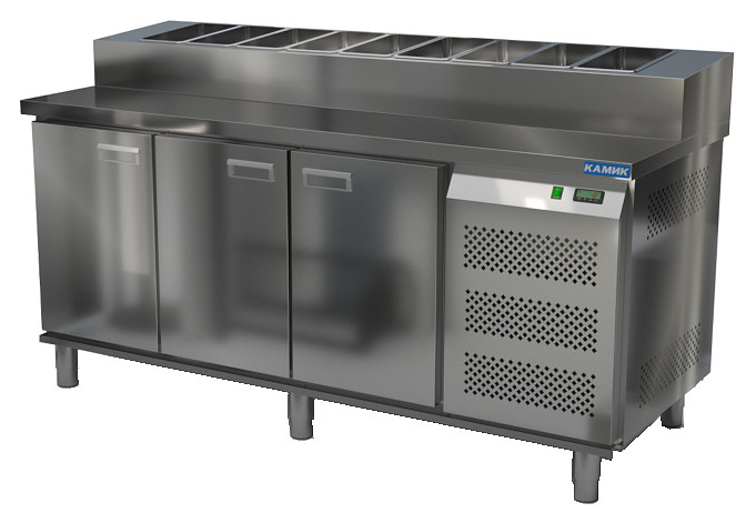 Холодильный стол КАМИК СОП-3018573 используется на предприятиях общественного питания и торговли для охлаждения и хранения продуктов, напитков и готовых блюд, а также для раскатки теста и обработки ингредиентов для приготовления пиццы. Конструкция разделена на секции, каждая секция с дверью оборудована сетчатой полкой и парой направляющих. Корпус выполнен из нержавеющей стали AISI 430 толщиной 1 мм, столешница - из нержавеющей стали AISI 304 толщиной 1 мм.
