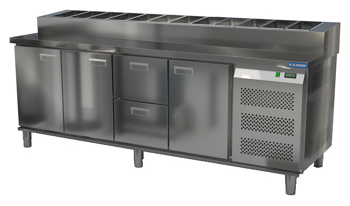 Холодильный стол КАМИК СОП-322376 используется на предприятиях общественного питания и торговли для охлаждения и хранения продуктов, напитков и готовых блюд, а также для раскатки теста и обработки ингредиентов для приготовления пиццы. Конструкция разделена на секции, каждая секция с дверью оборудована сетчатой полкой и парой направляющих. Корпус и столешница выполнены из нержавеющей стали AISI 430.