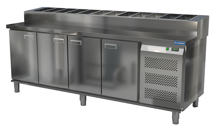 Холодильный стол КАМИК СОП-402373 используется на предприятиях общественного питания и торговли для охлаждения и хранения продуктов, напитков и готовых блюд, а также для раскатки теста и обработки ингредиентов для приготовления пиццы. Конструкция разделена на секции, каждая секция с дверью оборудована сетчатой полкой и парой направляющих. Корпус выполнен из нержавеющей стали AISI 430 толщиной 1 мм, столешница - из нержавеющей стали AISI 304 толщиной 1 мм.