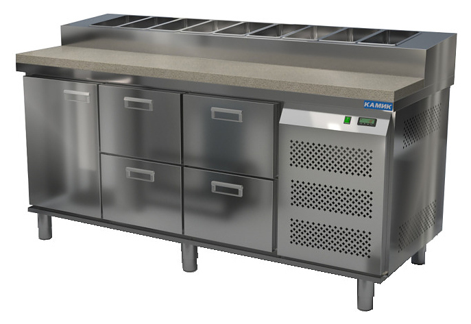 Холодильный стол КАМИК СОП-К-1418576 используется на предприятиях общественного питания и торговли для охлаждения и хранения продуктов, напитков и готовых блюд, а также для раскатки теста и обработки ингредиентов для приготовления пиццы. Конструкция разделена на секции, каждая из которых оборудована сетчатой полкой и парой направляющих. Корпус выполнен из нержавеющей стали AISI 430, столешница - из камня.