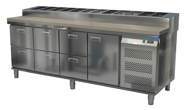 Холодильный стол КАМИК СОП-К-162376 используется на предприятиях общественного питания и торговли для охлаждения и хранения продуктов, напитков и готовых блюд, а также для раскатки теста и обработки ингредиентов для приготовления пиццы. Конструкция разделена на секции, каждая из которых оборудована сетчатой полкой и парой направляющих. Корпус выполнен из нержавеющей стали AISI 430, столешница - из камня.