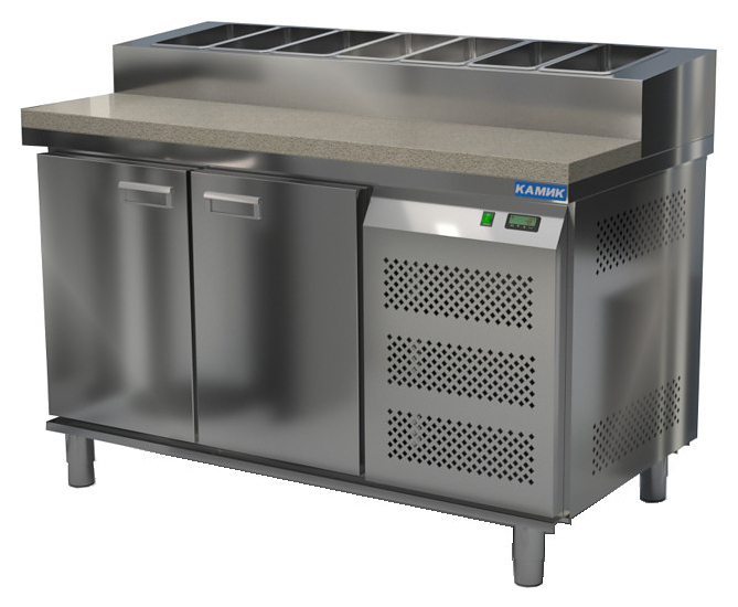 Холодильный стол КАМИК СОП-К-201476 используется на предприятиях общественного питания и торговли для охлаждения и хранения продуктов, напитков и готовых блюд, а также для раскатки теста и обработки ингредиентов для приготовления пиццы. Конструкция разделена на секции, каждая секция с дверью оборудована сетчатой полкой и парой направляющих. Корпус выполнен из нержавеющей стали AISI 430 толщиной 1 мм, столешница - из камня.