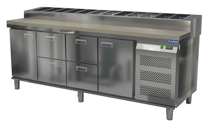 Холодильный стол КАМИК СОП-К-242373 используется на предприятиях общественного питания и торговли для охлаждения и хранения продуктов, напитков и готовых блюд, а также для раскатки теста и обработки ингредиентов для приготовления пиццы. Конструкция разделена на секции, каждая из которых оборудована сетчатой полкой и парой направляющих. Корпус выполнен из нержавеющей стали AISI 430 толщиной 1 мм, столешница - из камня.