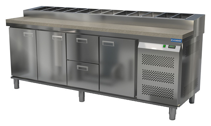 Холодильный стол КАМИК СОП-К-322373 используется на предприятиях общественного питания и торговли для охлаждения и хранения продуктов, напитков и готовых блюд, а также для раскатки теста и обработки ингредиентов для приготовления пиццы. Конструкция разделена на секции, каждая секция с дверью оборудована сетчатой полкой и парой направляющих. Корпус выполнен из нержавеющей стали AISI 430 толщиной 1 мм, столешница - из камня.