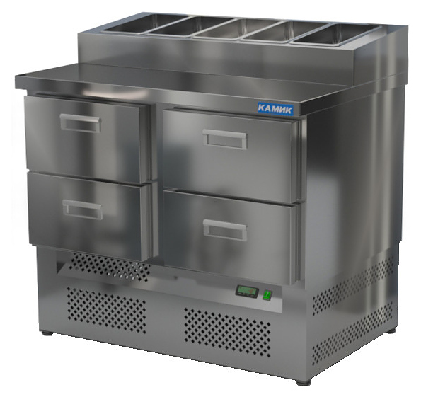 Холодильный стол КАМИК СОПН-041076 используется на предприятиях общественного питания и торговли для охлаждения и хранения продуктов, напитков и готовых блюд, а также для раскатки теста и обработки ингредиентов для приготовления пиццы. Конструкция разделена на секции, каждая секция с дверью оборудована сетчатой полкой и парой направляющих. Корпус выполнен из нержавеющей стали AISI 430 толщиной 1 мм, столешница - из нержавеющей стали AISI 304 толщиной 1 мм.