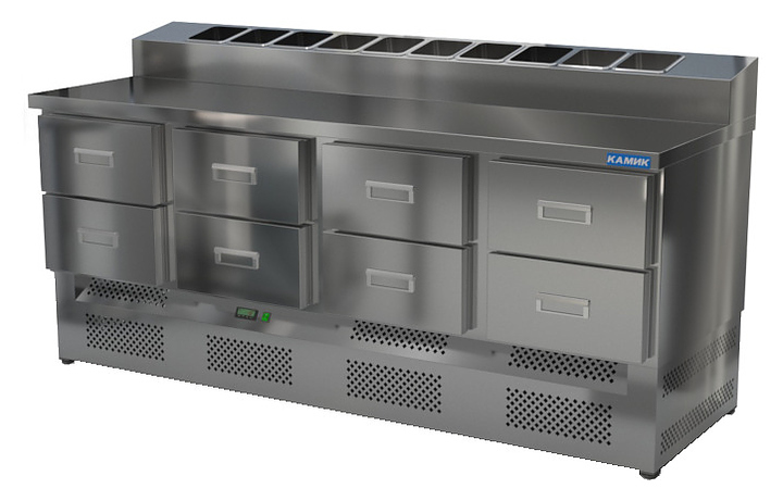 Холодильный стол КАМИК СОПН-082073 используется на предприятиях общественного питания и торговли для охлаждения и хранения продуктов, напитков и готовых блюд, а также для раскатки теста и обработки ингредиентов для приготовления пиццы. Конструкция разделена на секции, каждая секция с дверью оборудована сетчатой полкой и парой направляющих. Корпус выполнен из нержавеющей стали AISI 430 толщиной 1 мм, столешница - из нержавеющей стали AISI 304 толщиной 1 мм.