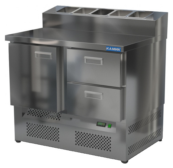 Холодильный стол КАМИК СОПН-121076 используется на предприятиях общественного питания и торговли для охлаждения и хранения продуктов, напитков и готовых блюд, а также для раскатки теста и обработки ингредиентов для приготовления пиццы. Конструкция разделена на секции, каждая секция с дверью оборудована сетчатой полкой и парой направляющих. Корпус выполнен из нержавеющей стали AISI 430 толщиной 1 мм, столешница - из нержавеющей стали AISI 304 толщиной 1 мм.