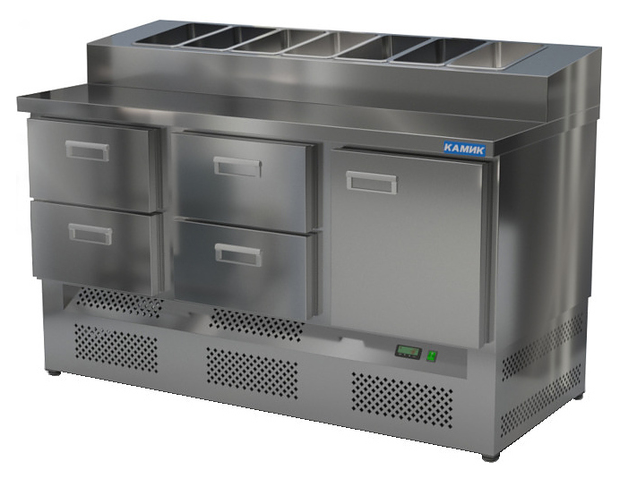 Холодильный стол КАМИК СОПН-141576 используется на предприятиях общественного питания и торговли для охлаждения и хранения продуктов, напитков и готовых блюд, а также для раскатки теста и обработки ингредиентов для приготовления пиццы. Конструкция разделена на секции, каждая секция с дверью оборудована сетчатой полкой и парой направляющих. Корпус выполнен из нержавеющей стали AISI 430 толщиной 1 мм, столешница - из нержавеющей стали AISI 304 толщиной 1 мм.
