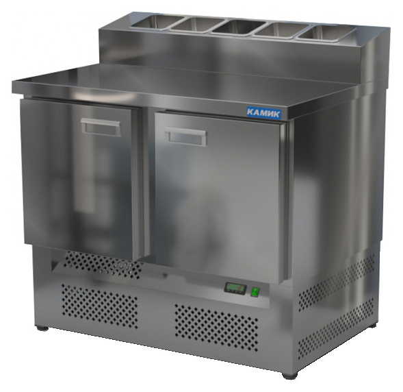 Холодильный стол КАМИК СОПН-201076 используется на предприятиях общественного питания и торговли для охлаждения и хранения продуктов, напитков и готовых блюд, а также для раскатки теста и обработки ингредиентов для приготовления пиццы. Конструкция разделена на секции, каждая секция с дверью оборудована сетчатой полкой и парой направляющих. Корпус выполнен из нержавеющей стали AISI 430 толщиной 1 мм, столешница - из нержавеющей стали AISI 304 толщиной 1 мм.