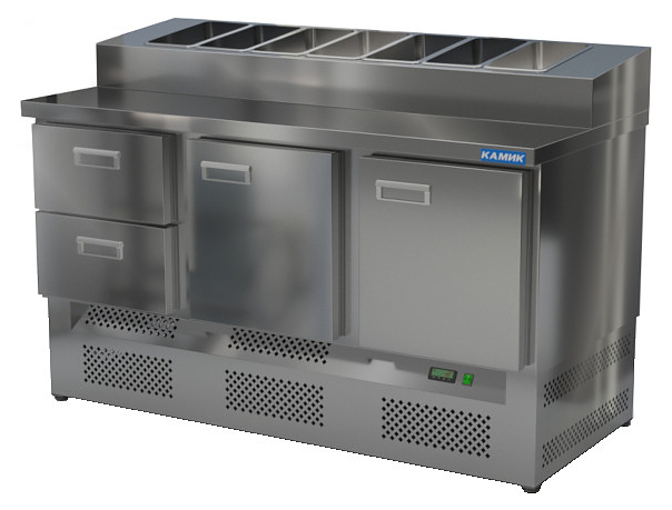 Холодильный стол КАМИК СОПН-221576 используется на предприятиях общественного питания и торговли для охлаждения и хранения продуктов, напитков и готовых блюд, а также для раскатки теста и обработки ингредиентов для приготовления пиццы. Конструкция разделена на секции, каждая секция с дверью оборудована сетчатой полкой и парой направляющих. Корпус выполнен из нержавеющей стали AISI 430 толщиной 1 мм, столешница - из нержавеющей стали AISI 304 толщиной 1 мм.