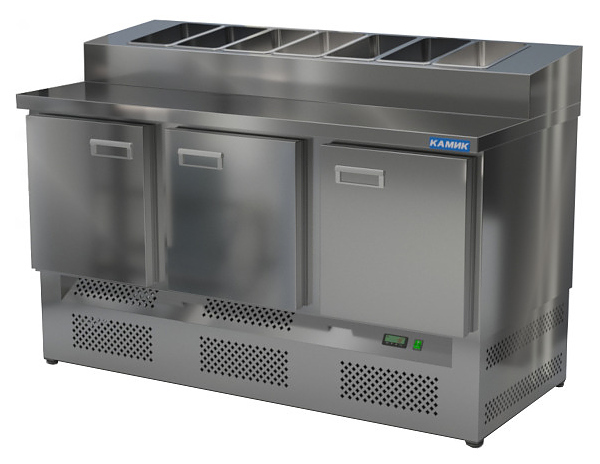 Холодильный стол КАМИК СОПН-301573 используется на предприятиях общественного питания и торговли для охлаждения и хранения продуктов, напитков и готовых блюд, а также для раскатки теста и обработки ингредиентов для приготовления пиццы. Конструкция разделена на секции, каждая секция с дверью оборудована сетчатой полкой и парой направляющих. Корпус выполнен из нержавеющей стали AISI 430 толщиной 1 мм, столешница - из нержавеющей стали AISI 304 толщиной 1 мм.