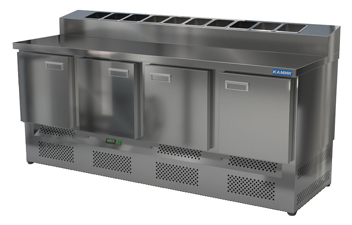 Холодильный стол КАМИК СОПН-402073 используется на предприятиях общественного питания и торговли для охлаждения и хранения продуктов, напитков и готовых блюд, а также для раскатки теста и обработки ингредиентов для приготовления пиццы. Конструкция разделена на секции, каждая секция с дверью оборудована сетчатой полкой и парой направляющих. Корпус выполнен из нержавеющей стали AISI 430 толщиной 1 мм, столешница - из нержавеющей стали AISI 304 толщиной 1 мм.