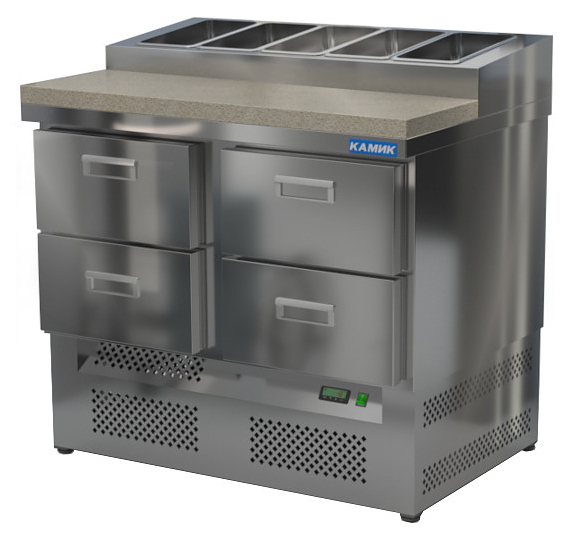 Холодильный стол КАМИК СОПН-К-041073 используется на предприятиях общественного питания и торговли для охлаждения и хранения продуктов, напитков и готовых блюд, а также для раскатки теста и обработки ингредиентов для приготовления пиццы. Конструкция разделена на секции, каждая секция с дверью оборудована сетчатой полкой и парой направляющих. Корпус выполнен из нержавеющей стали AISI 430 толщиной 1 мм, столешница - из камня.
