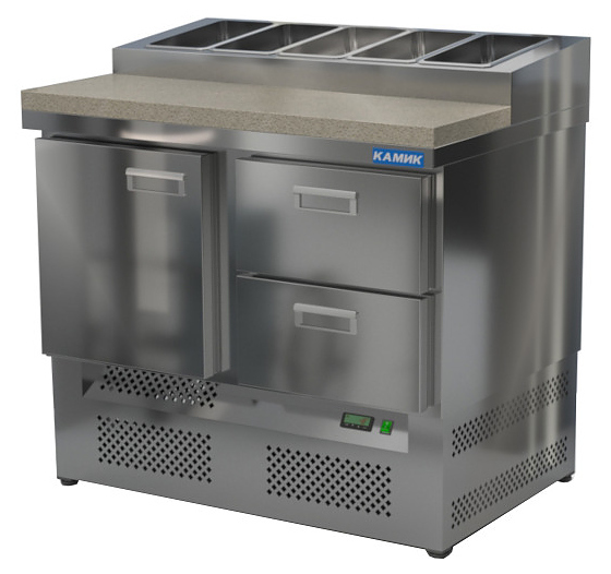 Холодильный стол КАМИК СОПН-К-121073 используется на предприятиях общественного питания и торговли для охлаждения и хранения продуктов, напитков и готовых блюд, а также для раскатки теста и обработки ингредиентов для приготовления пиццы. Конструкция разделена на секции, каждая секция с дверью оборудована сетчатой полкой и парой направляющих. Корпус выполнен из нержавеющей стали AISI 430 толщиной 1 мм, столешница - из камня.
