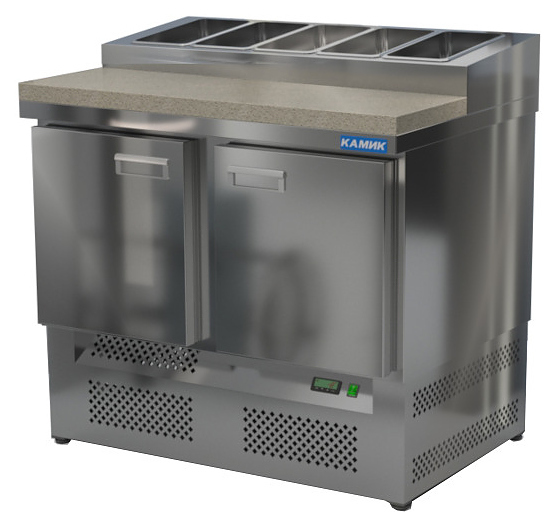Холодильный стол КАМИК СОПН-К-201073 используется на предприятиях общественного питания и торговли для охлаждения и хранения продуктов, напитков и готовых блюд, а также для раскатки теста и обработки ингредиентов для приготовления пиццы. Конструкция разделена на секции, каждая из которых оборудована сетчатой полкой и парой направляющих. Корпус выполнен из нержавеющей стали AISI 430 толщиной 1 мм, столешница - из камня.