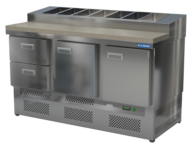 Холодильный стол КАМИК СОПН-К-221573 используется на предприятиях общественного питания и торговли для охлаждения и хранения продуктов, напитков и готовых блюд, а также для раскатки теста и обработки ингредиентов для приготовления пиццы. Конструкция разделена на секции, каждая секция с дверью оборудована сетчатой полкой и парой направляющих. Корпус выполнен из нержавеющей стали AISI 430 толщиной 1 мм, столешница - из камня.