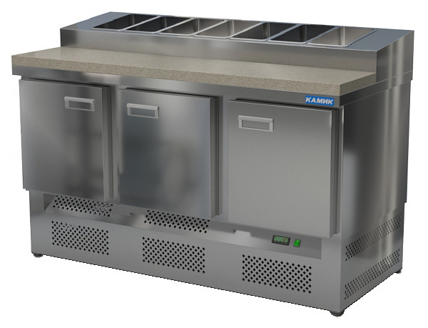 Холодильный стол КАМИК СОПН-К-301576 используется на предприятиях общественного питания и торговли для охлаждения и хранения продуктов, напитков и готовых блюд, а также для раскатки теста и обработки ингредиентов для приготовления пиццы. Конструкция разделена на секции, каждая из которых оборудована сетчатой полкой и парой направляющих. Корпус выполнен из нержавеющей стали AISI 430 толщиной 1 мм, столешница - из гранита.