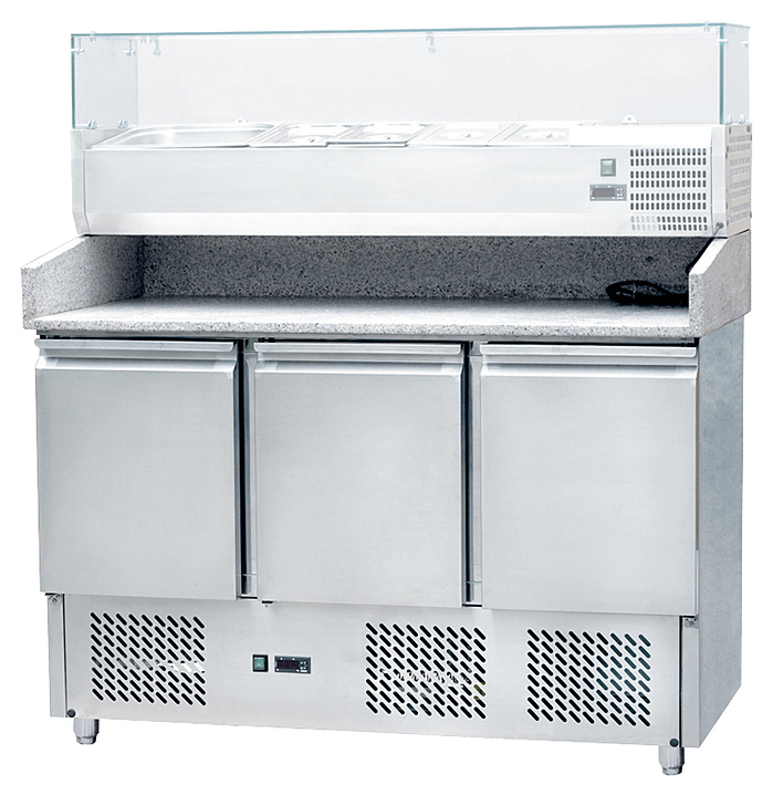 Холодильный стол для пиццы Koreco S903PZ используется на предприятиях общественного питания и торговли для раскатки теста и обработки ингредиентов для приготовления пиццы, охлаждения и кратковременного хранения скоропортящихся продуктов и напитков. Корпус и камера выполнены из нержавеющей стали AISI 304, бортик - из гранита, изоляция - из пенополиуретана.