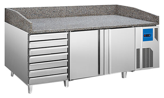 Холодильный стол для пиццы Koreco SPZ 2610 WN используется на предприятиях общественного питания и торговли для раскатки теста и обработки ингредиентов для приготовления пиццы, охлаждения и кратковременного хранения скоропортящихся продуктов и напитков.Модель оснащена регулируемыми по высоте ножками. Корпус выполнен из нержавеющей стали AISI 201, бортик - из гранита.