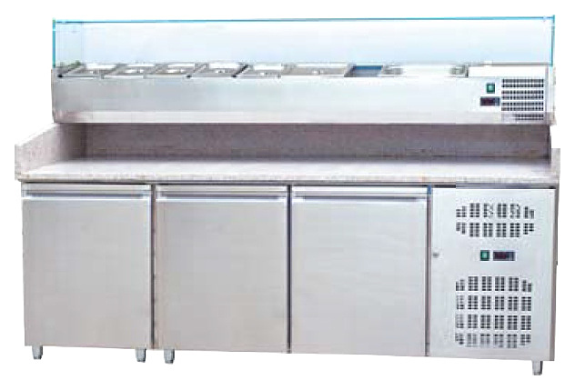Холодильный стол для пиццы Koreco SPZ 3600 TN используется на предприятиях общественного питания и торговли для раскатки теста и обработки ингредиентов для приготовления пиццы, охлаждения и кратковременного хранения скоропортящихся продуктов и напитков. Корпус выполнен из нержавеющей стали AISI 304, бортик - из гранита.