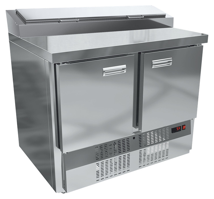 Холодильный стол KRONER СХП 2-100-70 предназначен для обработки и сохранения свежести ингредиентов для приготовления пиццы на предприятиях общественного питания и торговли. Модель оснащена встроенным компрессорным холодильным агрегатом с нижним расположением, столешницей с охлаждаемой надстройкой с откидной крышкой для размещения гастроемкостей, электронной панелью управления и холодильной камерой с 2 секциями с распашными дверьми. Корпус и столешница выполнены из шлифованной нержавеющей стали, задняя стенка – из оцинкованной стали.