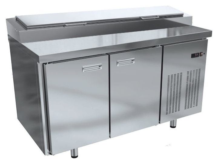 Холодильный стол KRONER СХП 2-140-70 предназначен для обработки и сохранения свежести ингредиентов для приготовления пиццы на предприятиях общественного питания и торговли. Модель оснащена встроенным компрессорным холодильным агрегатом с боковым расположением, столешницей с охлаждаемой надстройкой с откидной крышкой для размещения гастроемкостей, электронной панелью управления и холодильной камерой с 2 секциями с распашными дверьми. Корпус и столешница выполнены из шлифованной нержавеющей стали, задняя стенка – из оцинкованной стали.