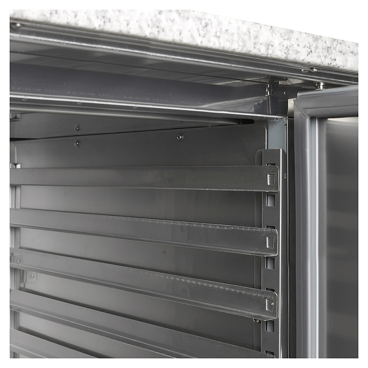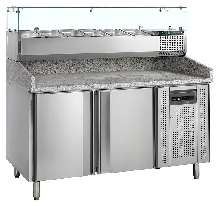 Холодильный стол TEFCOLD PT1200 + VK38-150 предназначен для обработки ингредиентов и хранения готовых топпингов, полуфабрикатов из мяса, рыбы и других продуктов для приготовления пиццы на предприятиях общественного питания и торговли. Стол оснащен расположенным справа агрегатным отсеком, столешницей с задним и боковыми бортами, 2 секциями с глухими распашными дверьми с интегрированными в боковую часть вертикальными рукоятками, 7 уровнями направляющих для противней в каждой секции и панелью управления, расположенная над столешницей витрина для гастроемкостей – агрегатным отсеком снизу, салат-баром, верхним прозрачным остеклением и панелью управления. Внутренняя облицовка и экстерьер корпусов выполнены из высококачественной нержавеющей стали марки SS304, столешница и борты – из гранита.