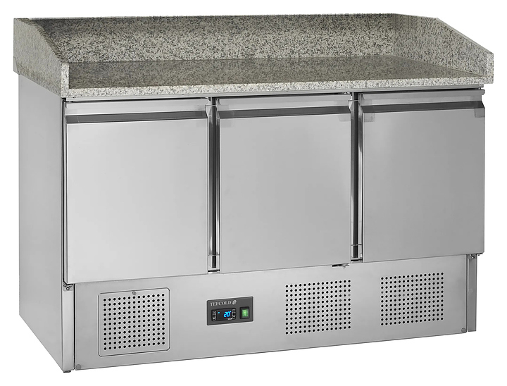 Холодильный стол TEFCOLD PT1365 предназначен для обработки ингредиентов и хранения полуфабрикатов из мяса, рыбы и других продуктов для приготовления пиццы на предприятиях общественного питания и торговли. Модель оснащена расположенным снизу агрегатным отсеком, столешницей с задним и боковыми бортами, 3 секциями с глухими распашными дверьми с интегрированными в верхнюю часть горизонтальными рукоятками и кнопочной панелью управления с цифровым дисплеем. Внутренняя облицовка и экстерьер корпуса выполнены из высококачественной нержавеющей стали марки SS304, столешница и борты – из гранита.