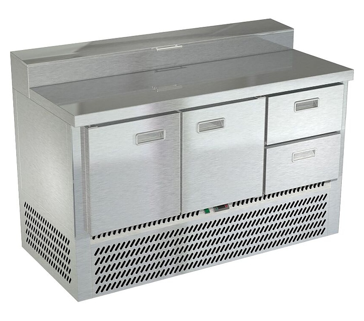 Холодильный стол Техно-ТТ СПН/П-127/22-1407 предназначен для обработки ингредиентов, используемых для приготовления пиццы, охлаждения и кратковременного хранения продуктов на предприятиях общественного питания и торговли. Модель оснащена коробом для установки гастроемкостей, крышкой, 2 выдвижными ящиками с доводчиками, 2 распашными дверьми, полкой-решеткой и регулируемыми по высоте ножками. Корпус и столешница выполнены из нержавеющей стали AISI 430, задняя стенка и дно - из оцинкованной стали.