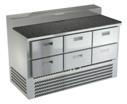 Холодильный стол Техно-ТТ СПН/П-327/06-1407 предназначен для обработки ингредиентов, используемых для приготовления пиццы, охлаждения и кратковременного хранения продуктов на предприятиях общественного питания и торговли. Модель оснащена коробом для установки гастроемкостей, крышкой, 6 выдвижными ящиками с доводчиками и регулируемыми по высоте ножками. Корпус выполнен из нержавеющей стали AISI 430, задняя стенка и дно - из оцинкованной стали, столешница - из камня.