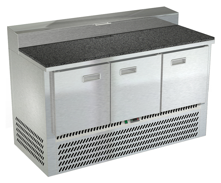 Холодильный стол Техно-ТТ СПН/П-327/30-1407 предназначен для обработки ингредиентов, используемых для приготовления пиццы, охлаждения и кратковременного хранения продуктов на предприятиях общественного питания и торговли. Модель оснащена коробом для установки гастроемкостей, крышкой, 3 распашными дверьми с доводчиками, полкой-решеткой и регулируемыми по высоте ножками. Корпус выполнен из нержавеющей стали AISI 430, задняя стенка и дно - из оцинкованной стали, столешница - из камня.