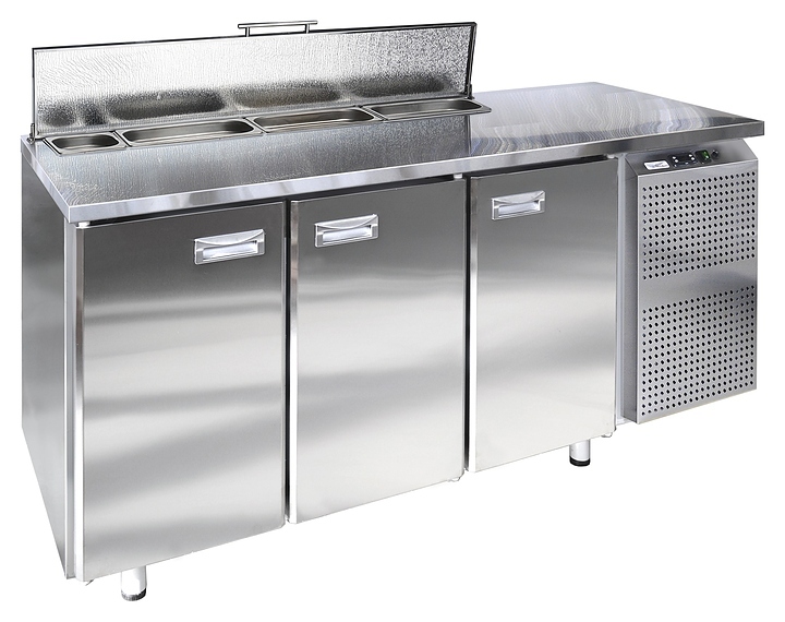 Холодильный стол Finist СХСс-700-3 предназначен для сохранения свежести ингредиентов для холодных закусок и салатов на предприятиях общественного питания и торговли. Модель оснащена расположенным сбоку агрегатным отсеком, столешницей с задним бортом и отсеком под гастроемкости с крышкой, 3 холодильными камерами с распашными дверцами, устойчивыми ножками с подпятниками, кабелем питания с евровилкой и кнопочной панелью управления с цифровым дисплеем. Цельнозаливной корпус выполнен из высококачественной нержавеющей стали.