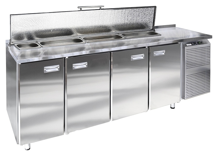 Холодильный стол Finist СХСс-700-4 предназначен для сохранения свежести ингредиентов для холодных закусок и салатов на предприятиях общественного питания и торговли. Модель оснащена расположенным сбоку агрегатным отсеком, столешницей с задним бортом и отсеком под гастроемкости с крышкой, 4 холодильными камерами с распашными дверцами, устойчивыми ножками с подпятниками, кабелем питания с евровилкой и кнопочной панелью управления с цифровым дисплеем. Цельнозаливной корпус выполнен из высококачественной нержавеющей стали.