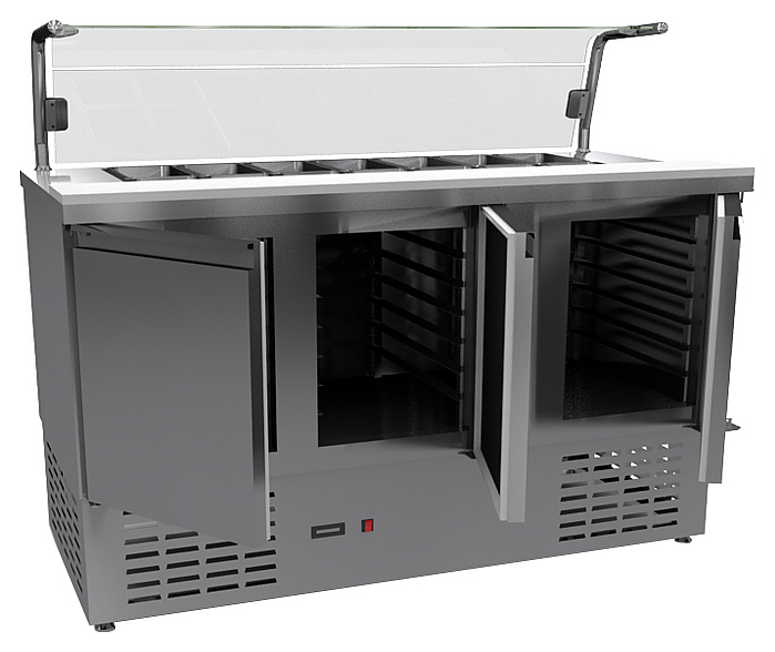 Холодильный стол КАМИК СОН-111021 используется на предприятиях общественного питания и торговли для охлаждения, демонстрации и кратковременного хранения ингредиентов для приготовления салатов, напитков и готовых блюд. Конструкция имеет модульное строение и разделена на секции, каждая из которых оборудована сетчатой полкой и парой направляющих. Корпус выполнен из нержавеющей стали.
