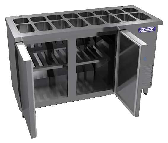 Холодильный стол КАМИК СОН-114601 используется на предприятиях общественного питания и торговли для охлаждения, демонстрации и кратковременного хранения ингредиентов для приготовления салатов, напитков и готовых блюд. Конструкция имеет модульное строение и разделена на секции, каждая секция с дверью оборудована сетчатой полкой и парой направляющих. Корпус выполнен из нержавеющей стали.